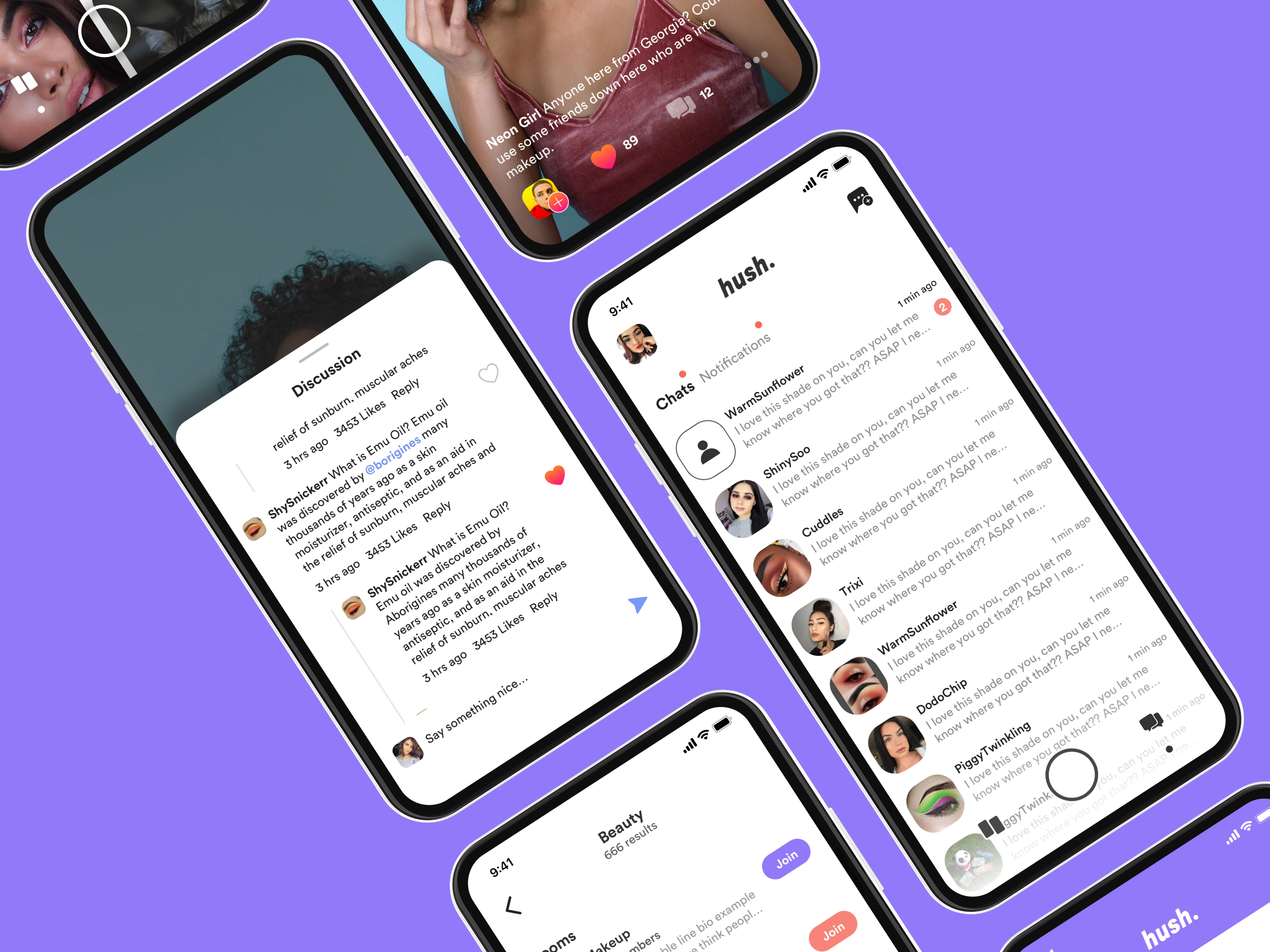 The brand refresh kept the warmth and accessibility that Hush users already responded to — this wasn't a repositioning exercise. The work was about giving the visual system enough structure to hold across web, iOS, Android, and marketing without fracturing. Palette refinement, type hierarchy, and a set of usage rules that could survive handoff to a growing team.
