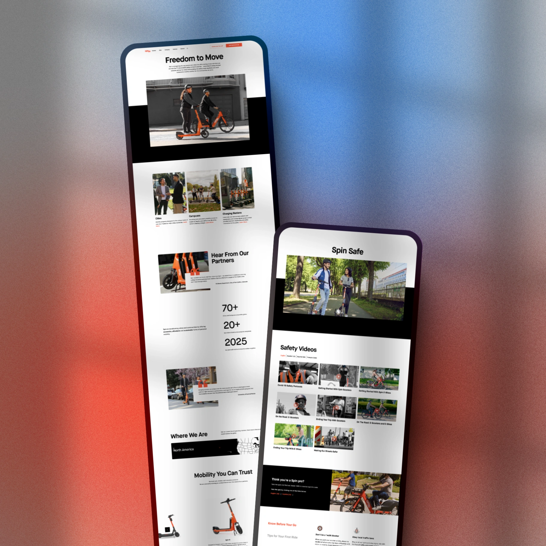 The website redesign had to serve riders and city officials simultaneously — two audiences with completely different intent and information needs. The information architecture was rebuilt so a rider could get to the app download in seconds, while a city or campus partner had a clear, substantive path through Spin's operational story, safety record, and partner testimonials. These paths had to coexist without either feeling like an afterthought.
