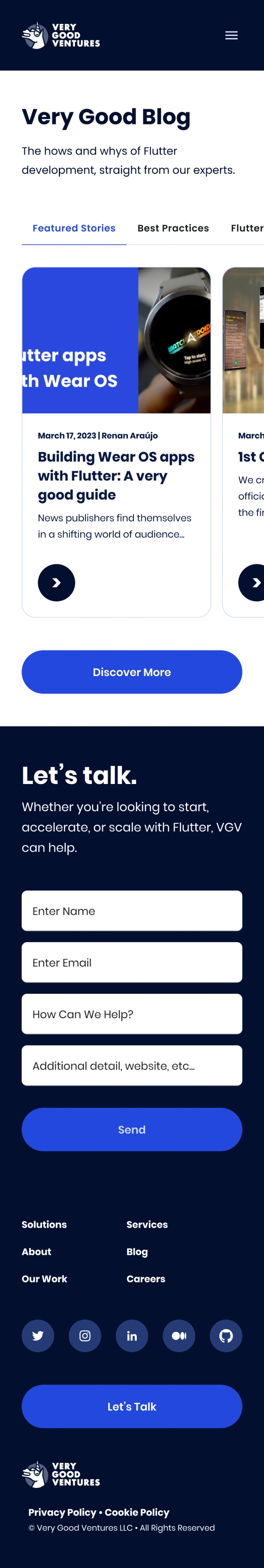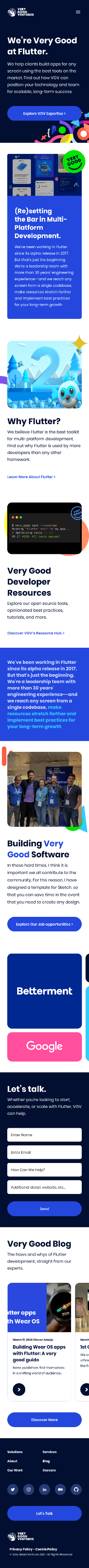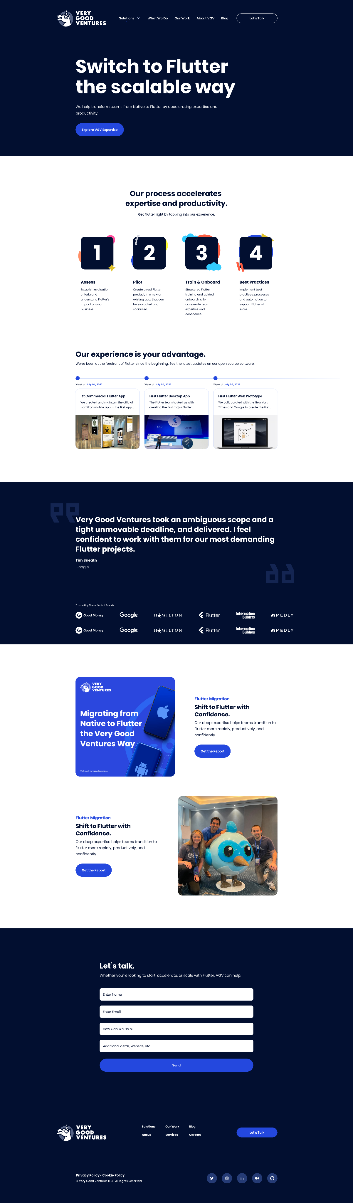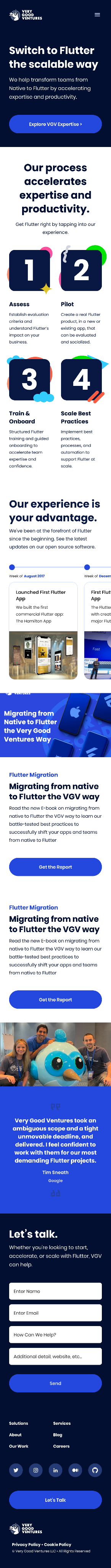 The previous site was a serviceable dark-navy layout with a functional blue accent and nav that had accumulated links over time. It communicated 'Flutter agency' but not 'the Flutter agency.' Enterprise clients doing their pre-call research weren't getting a fast read on what made VGV the right choice over any other capable technical shop.