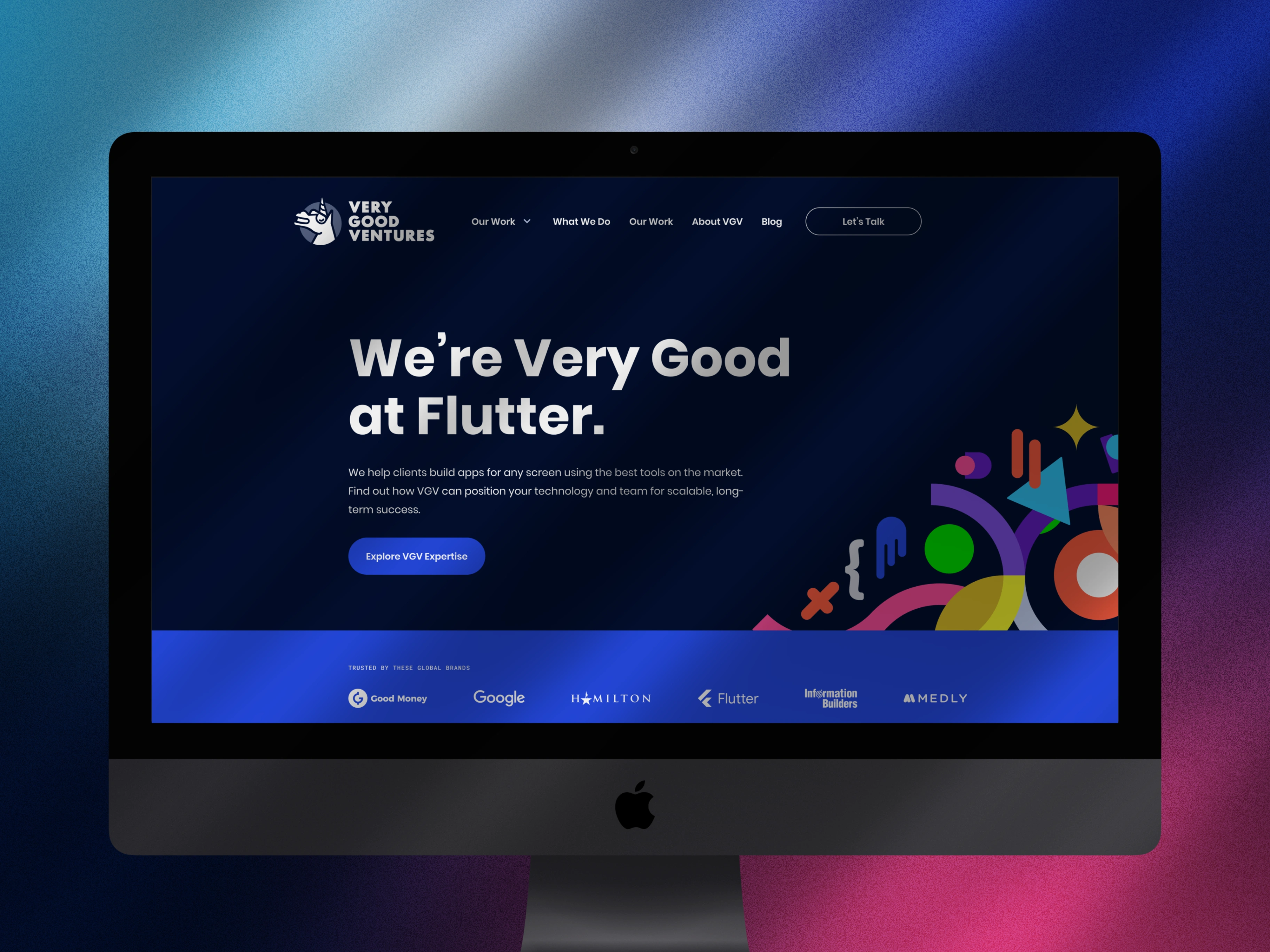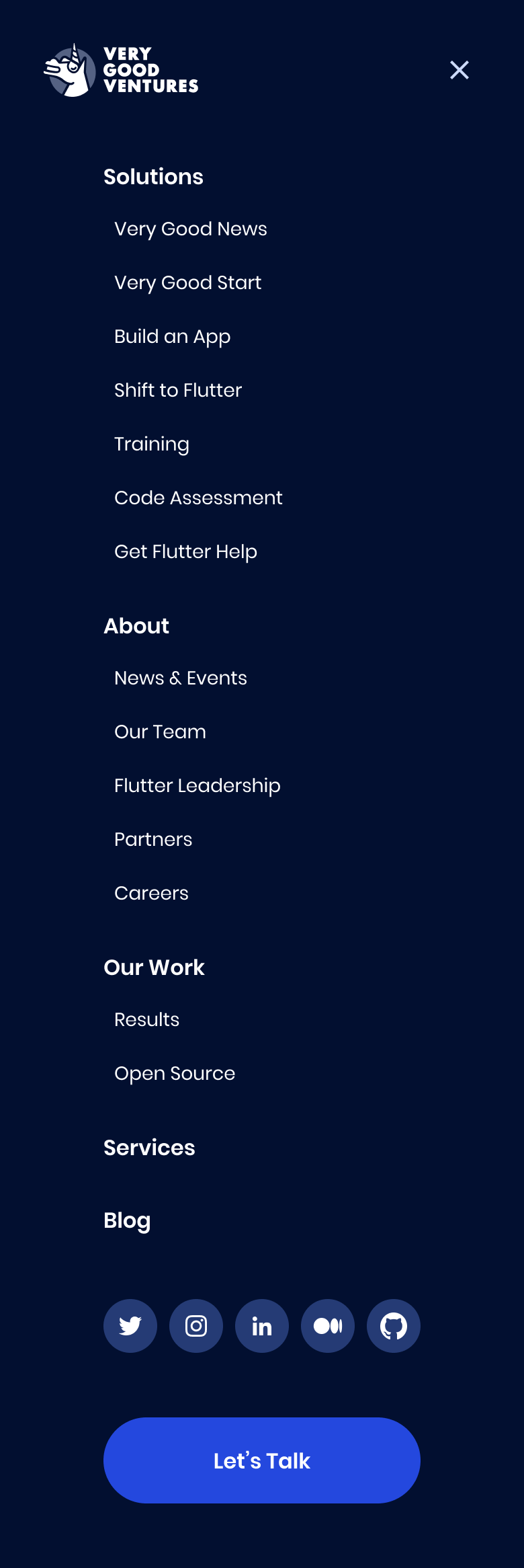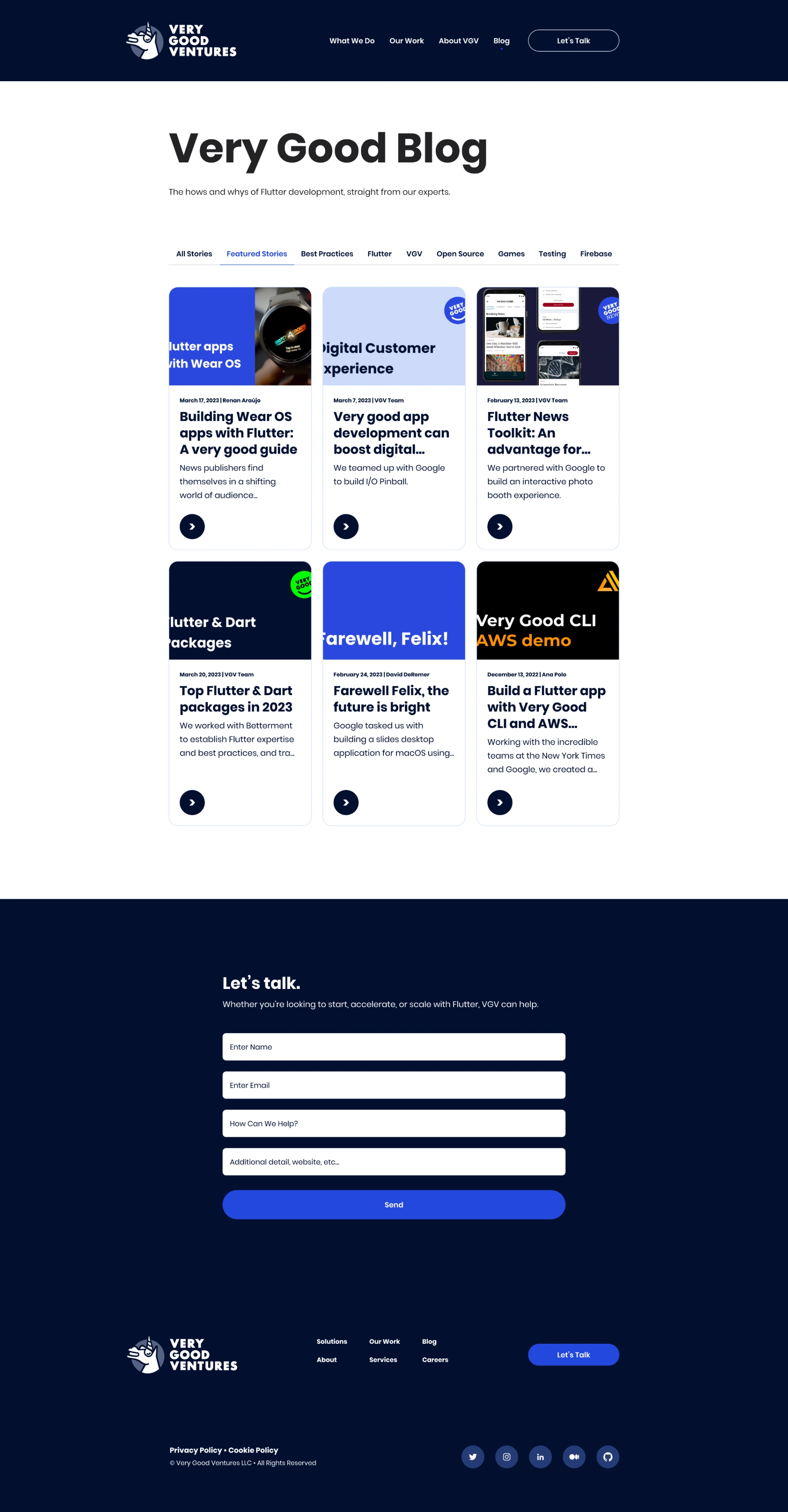 The previous site was a serviceable dark-navy layout with a functional blue accent and nav that had accumulated links over time. It communicated 'Flutter agency' but not 'the Flutter agency.' Enterprise clients doing their pre-call research weren't getting a fast read on what made VGV the right choice over any other capable technical shop.