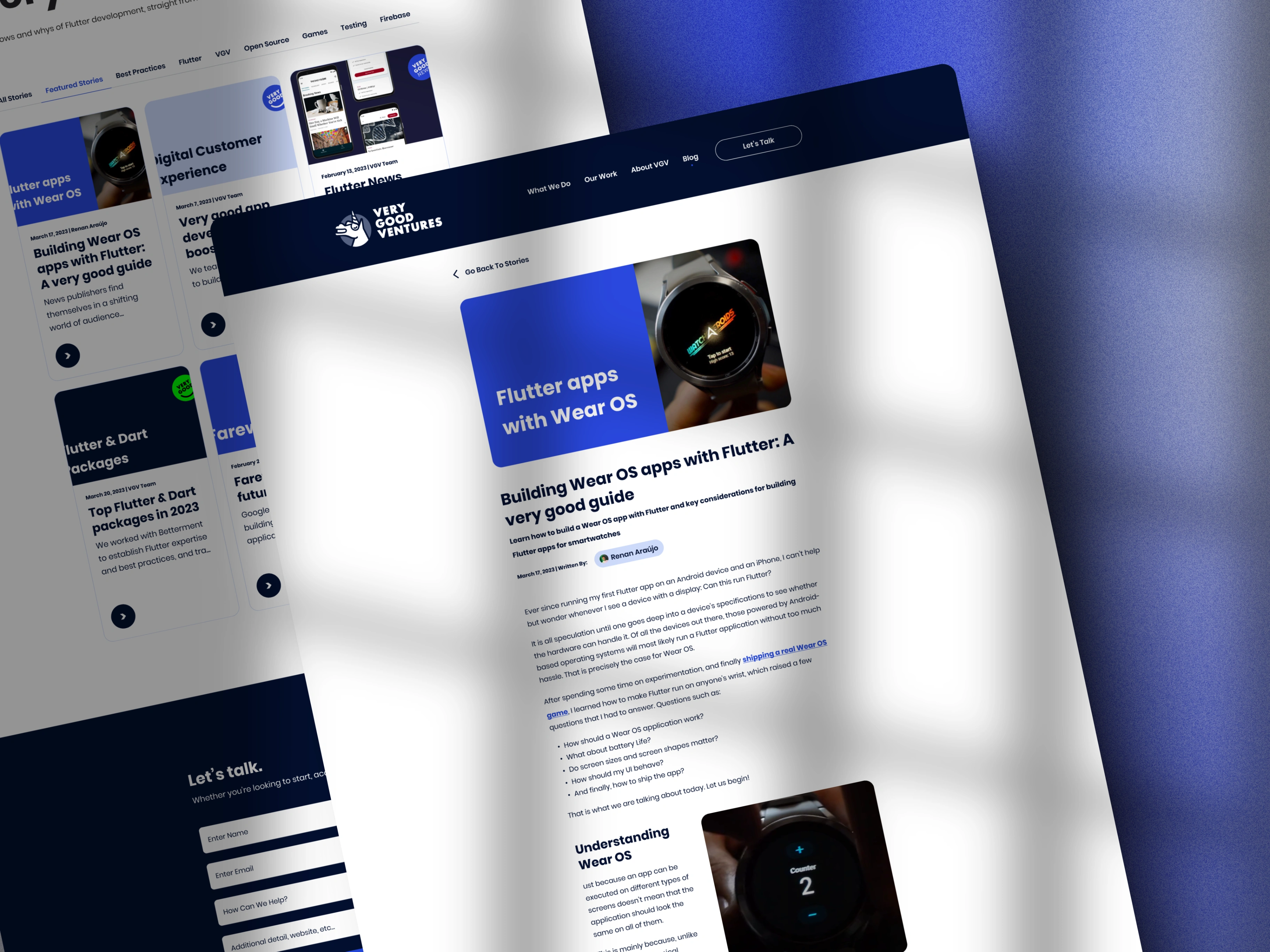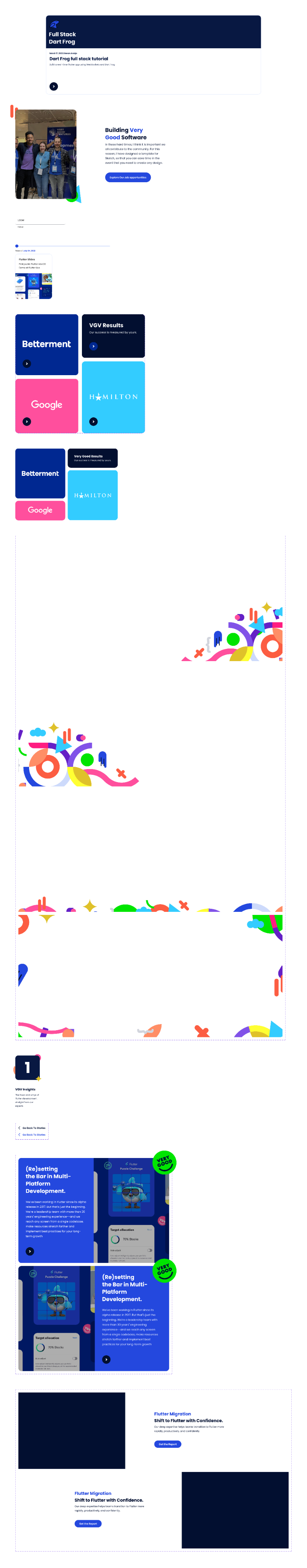 The phase that mattered most was establishing the visual language. VGV's existing palette and type system were doing the minimum — dark navy, a functional blue, nothing that distinguished the brand from a dozen other dev-focused agencies. Getting that right unlocked everything downstream: the component library, the editorial layouts for case studies and blog content, the way GenUI and their other capability areas got surfaced without making the nav feel like a product catalog.
