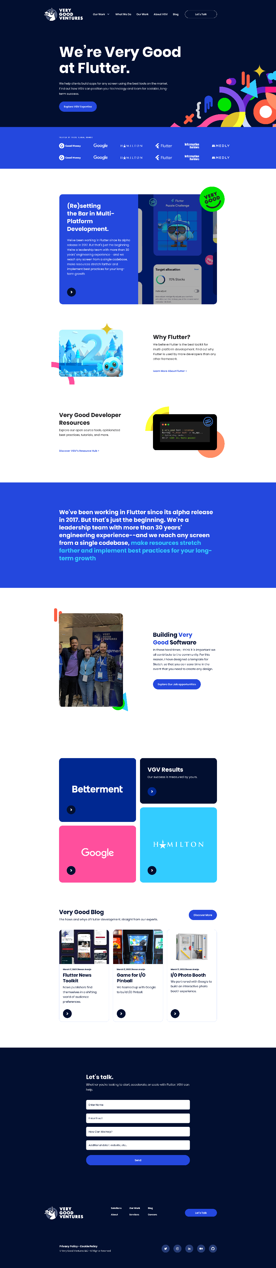 Very Good Ventures is the leading Flutter development agency — a highly technical, deeply credentialed shop that builds cross-platform apps for enterprises across entertainment, fintech, and travel. Boneyard delivered a full website redesign: new visual identity, UX architecture, and frontend build, replacing a site that no longer matched the company's standing in the market.