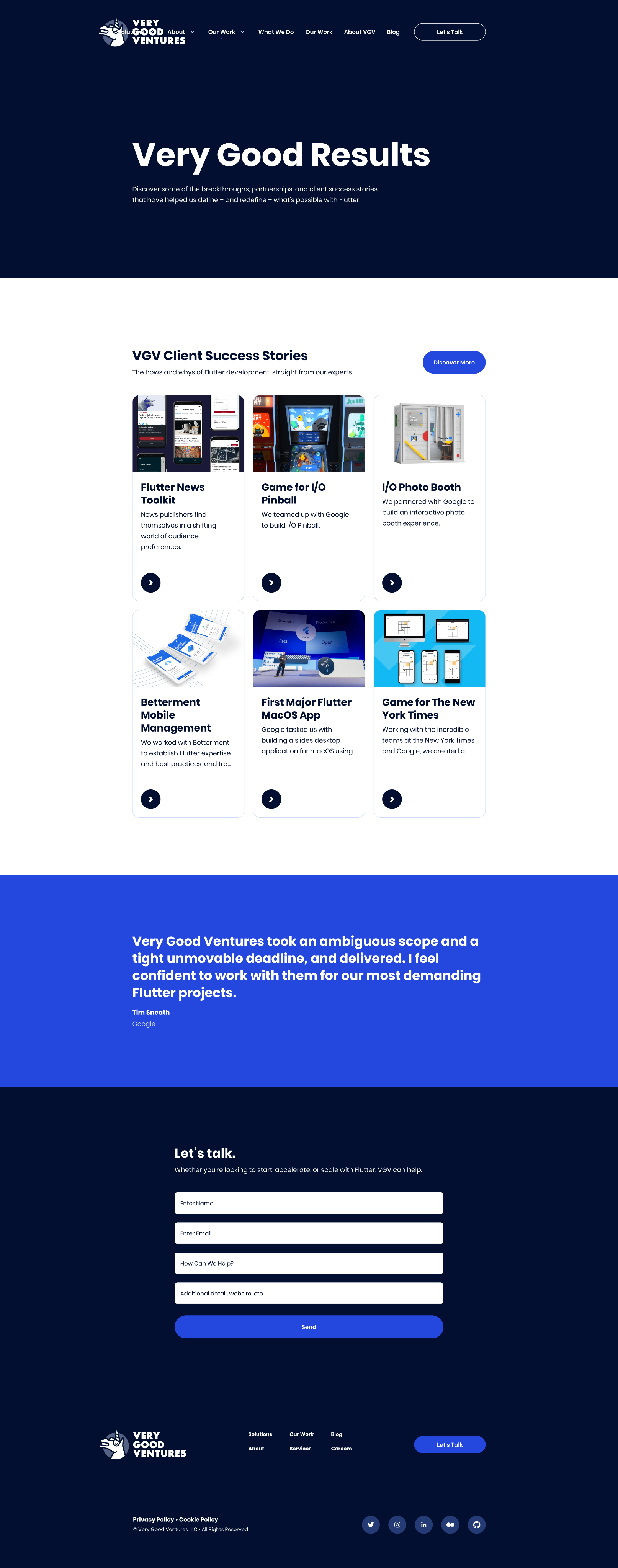 The new site gives VGV a visual presence that matches their actual market position. Enterprise prospects arriving from a referral or a conference now land on something that reads as authoritative from the first scroll — the case study names are prominent, the capability areas are clearly differentiated, and the brand has enough visual confidence to sit credibly next to the companies VGV works with. Internally, the component system gives the VGV team a foundation for ongoing content — new case studies, blog posts, and service pages slot into the system without requiring design from scratch each time. The redesign didn't just update what was there; it gave the company a site infrastructure built for where they're going, not where they've been.