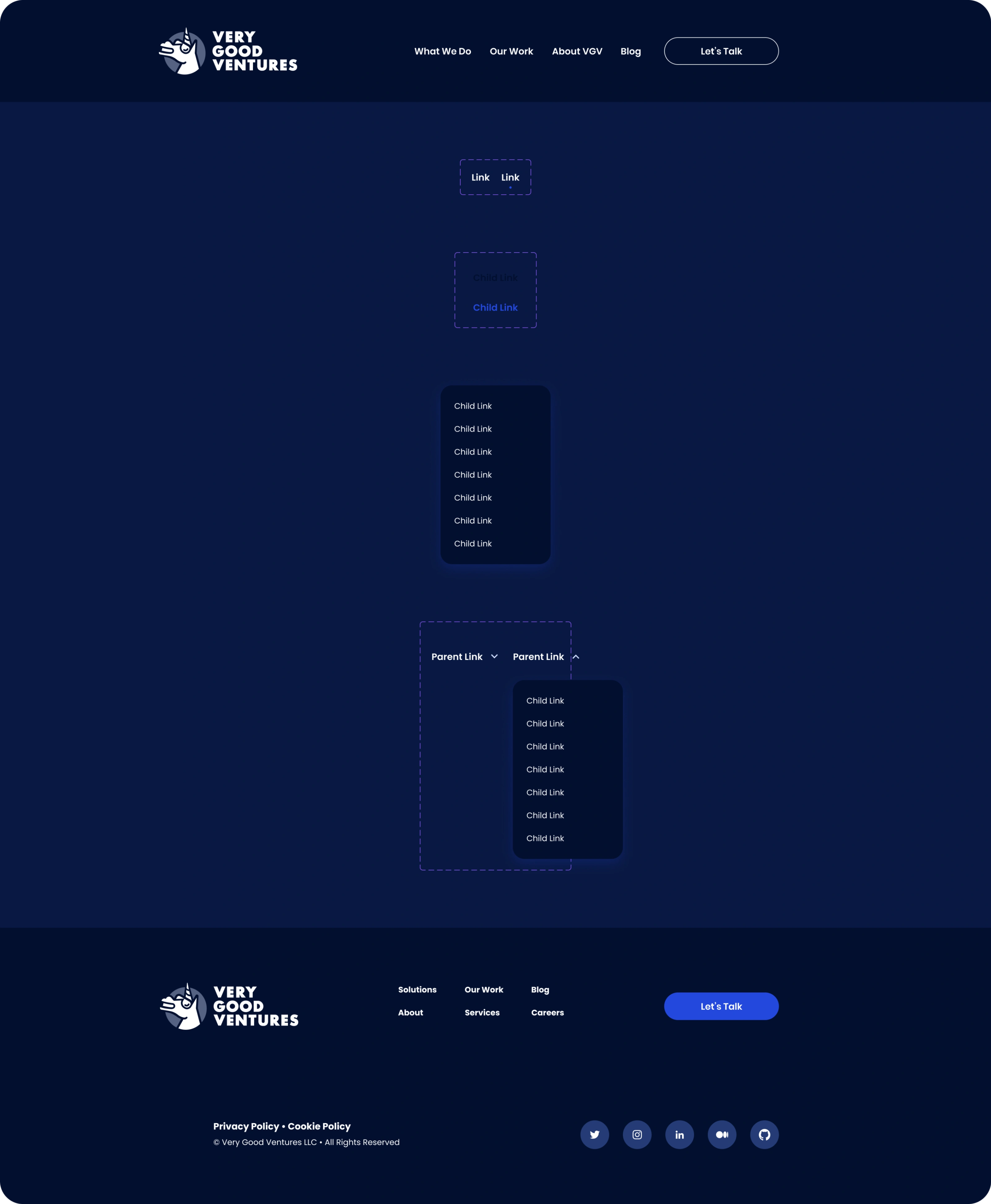 We delivered a full component library alongside the page designs — not just comps, but a structured set of building blocks that the engineering build could use directly. This meant the frontend stayed faithful to the design intent without a lossy translation step, and VGV's team has a real system to work from when adding new content going forward.